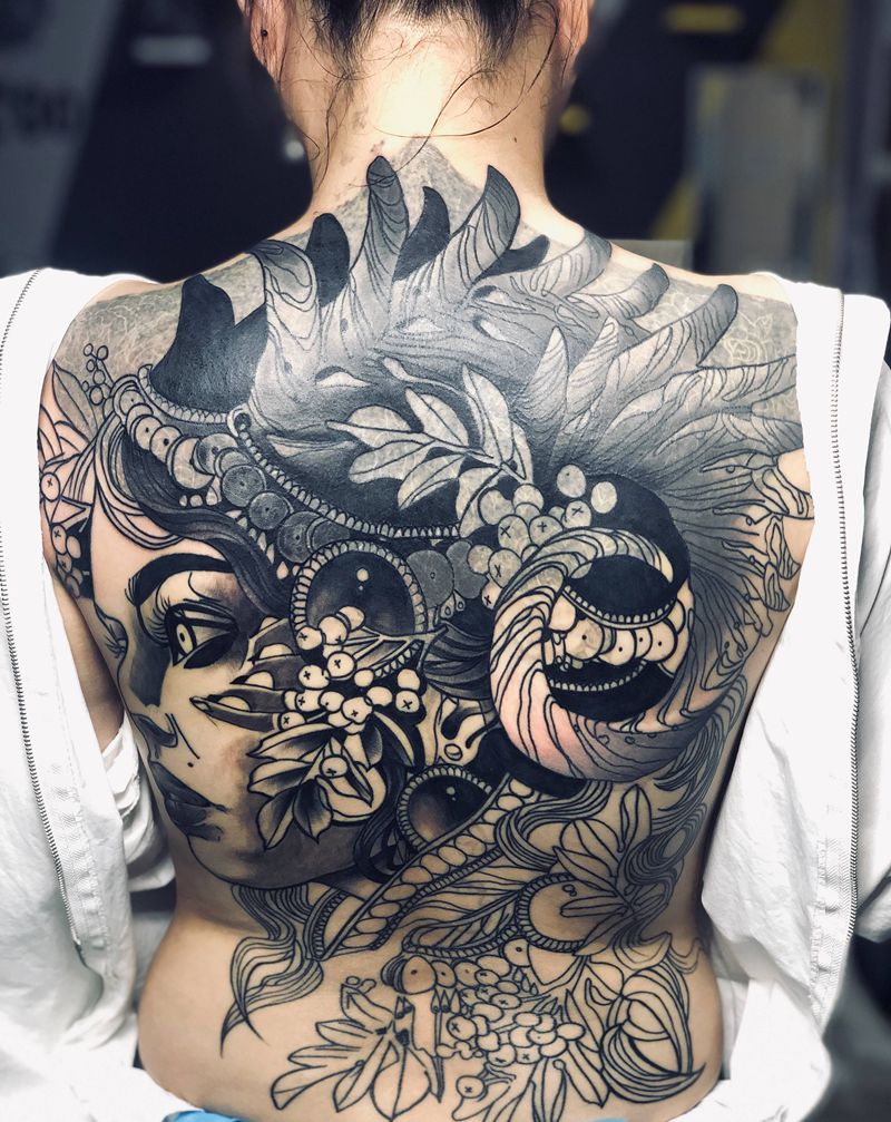 当前位置: 首页 >广东省广州市纹身店-墨刺青工作室纹身图案>#满背纹身#暂时完成60%纹身图片_背部New School欧美写实纹身图案