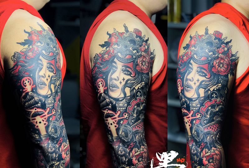 当前位置: 首页 >广东省广州市纹身店-墨刺青工作室纹身图案>包臂系列纹身图片_手臂New School水彩纹身图案