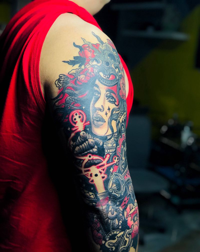 当前位置: 首页 >广东省广州市纹身店-墨刺青工作室纹身图案>包臂系列纹身图片_手臂New School水彩纹身图案