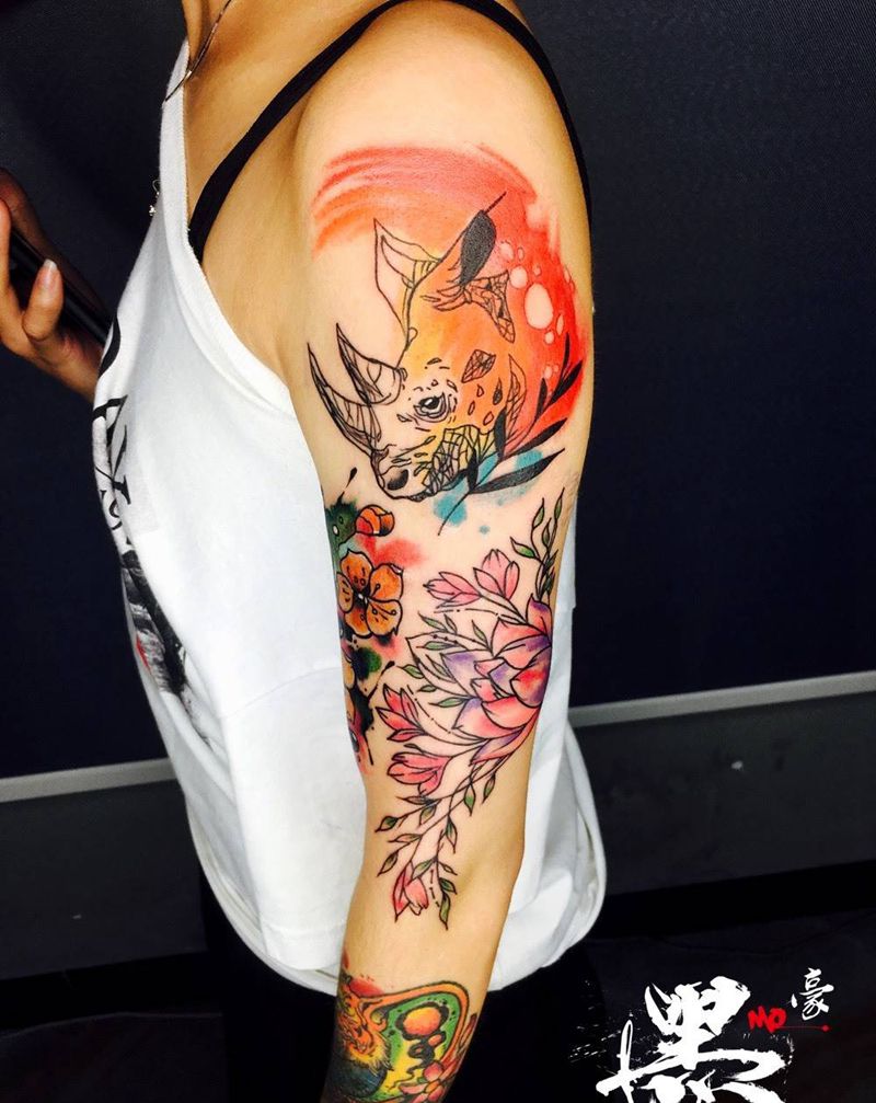 花臂拼接小图纹身图片_成品手臂动物花都广州遮盖纹身图案