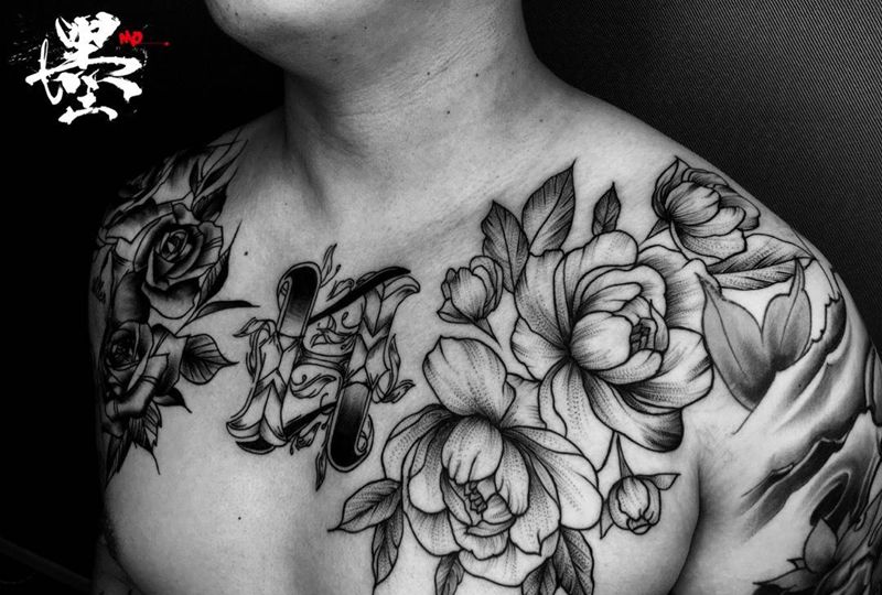 玫瑰花&牡丹花纹身图片_成品胸部植物广州花都纹身图案
