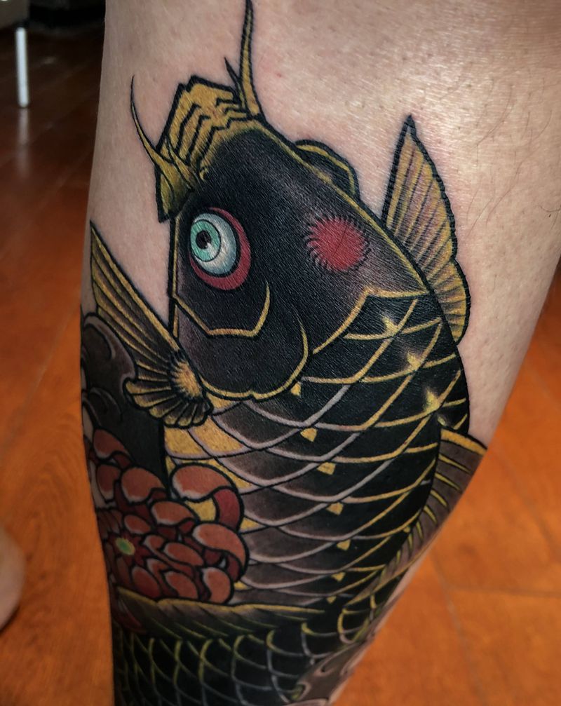 当前位置: 首页 >广东省深圳市纹身店-硬记刺青纹身图案>鲤鱼遮盖作品、纹身图片_腿部腹部老传统新传统纹身图案