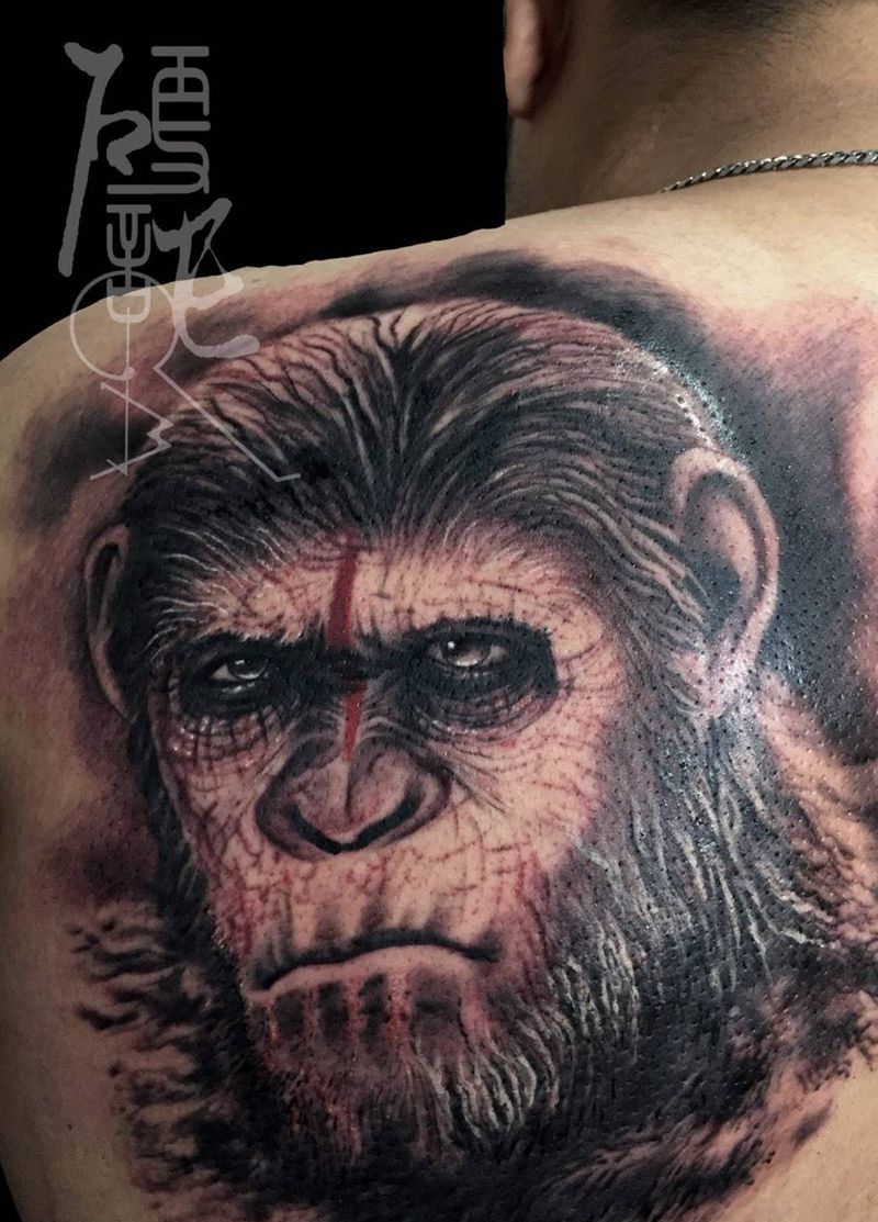 猩猩凯撒纹身图片_动物腿部手臂背部写实纹身图案