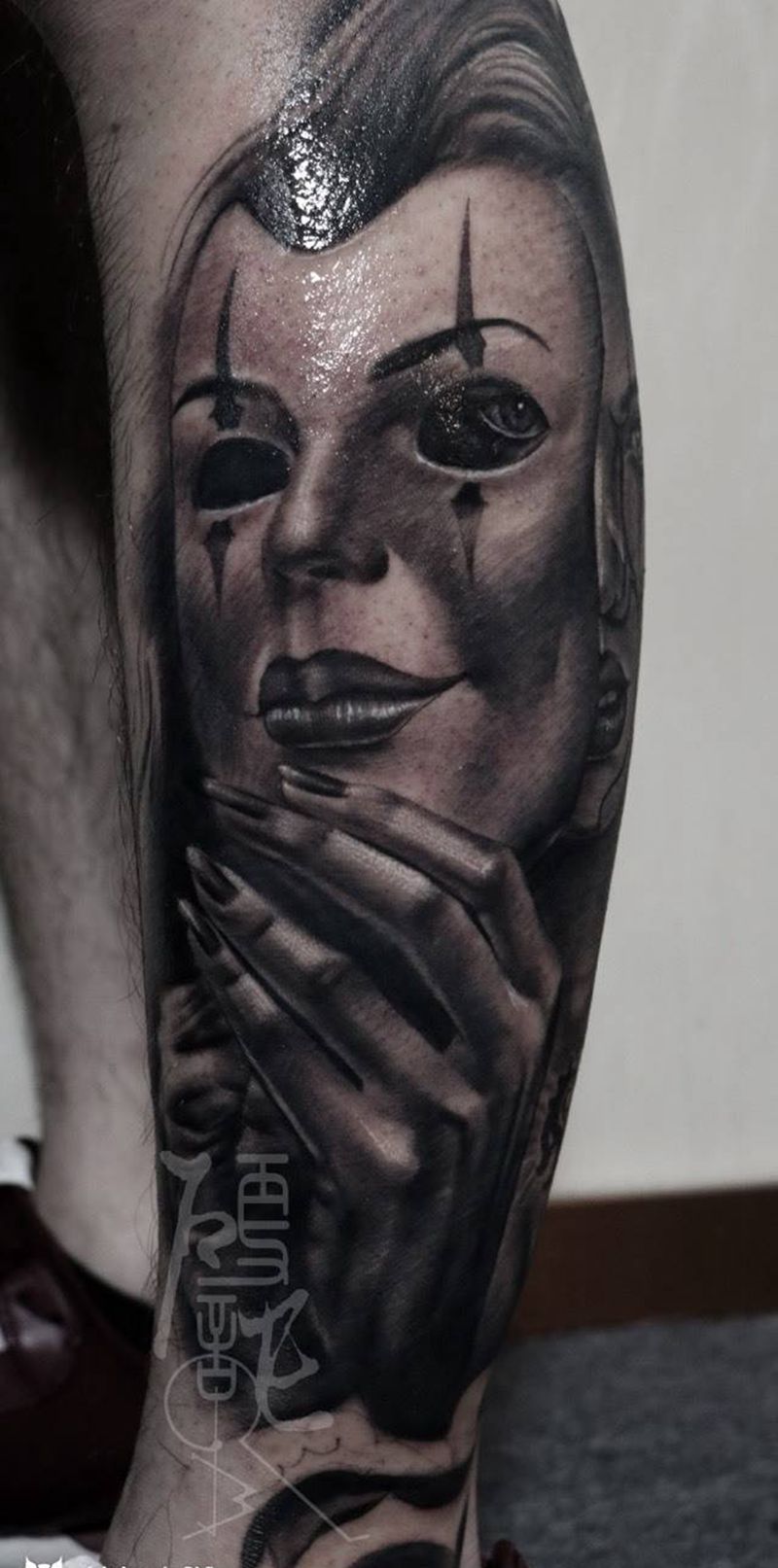 • T包小腿吹火男+阿多福纹身图片_腿部老传统新传统吹火男阿