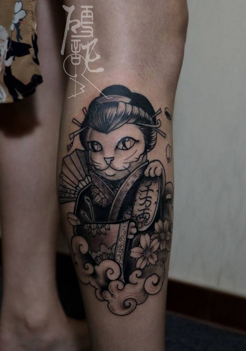招财猫纹身图片_肩部腰部传统欧美肖像人物纹身图案