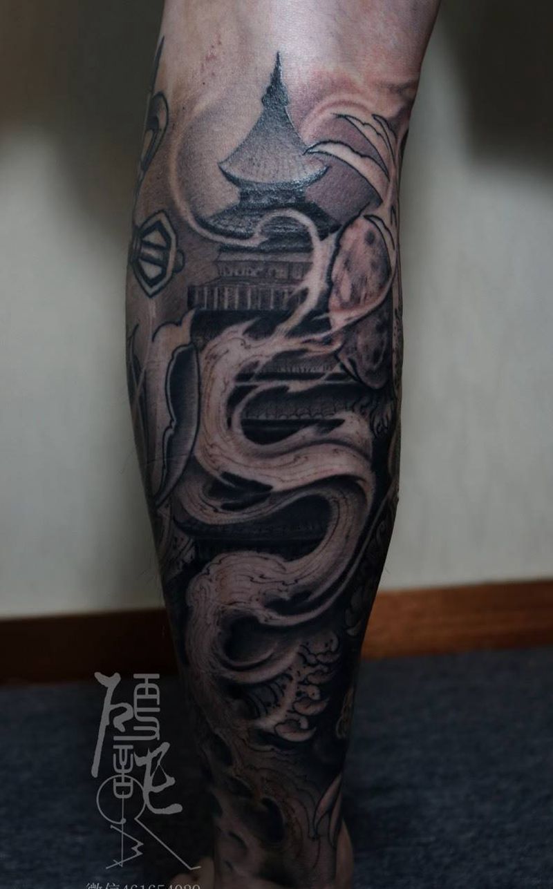 • T网红王老大花腿龙纹身图片_腿部新传统纹身图案