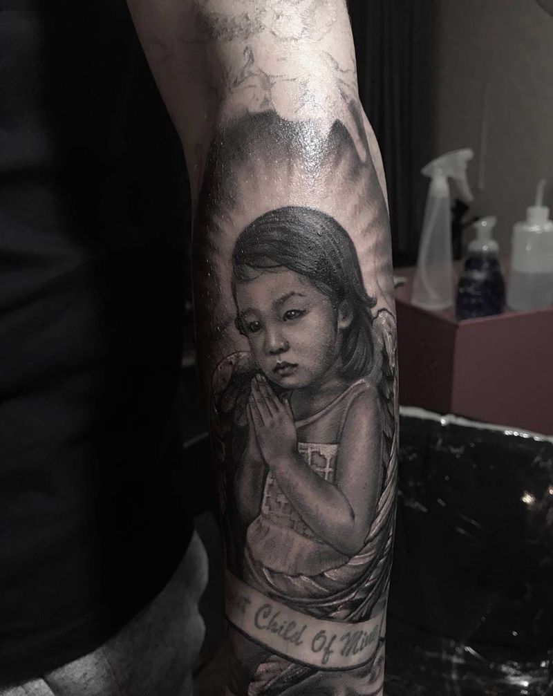 当前位置: 首页 >广东省深圳市纹身店-硬记刺青纹身图案>人物肖像纹身图片_手部手臂欧美写实人物肖像纹身图案