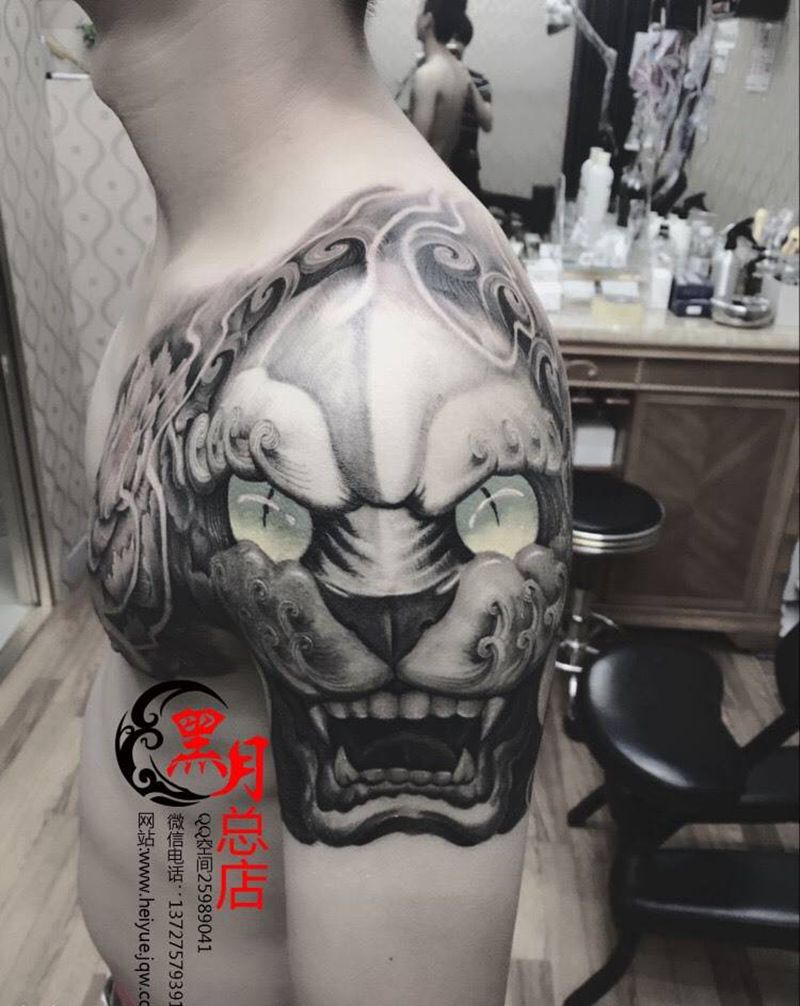 当前位置: 首页 >广东省韶关市纹身店-黑月纹身总店纹身图案>唐狮半甲纹身图片