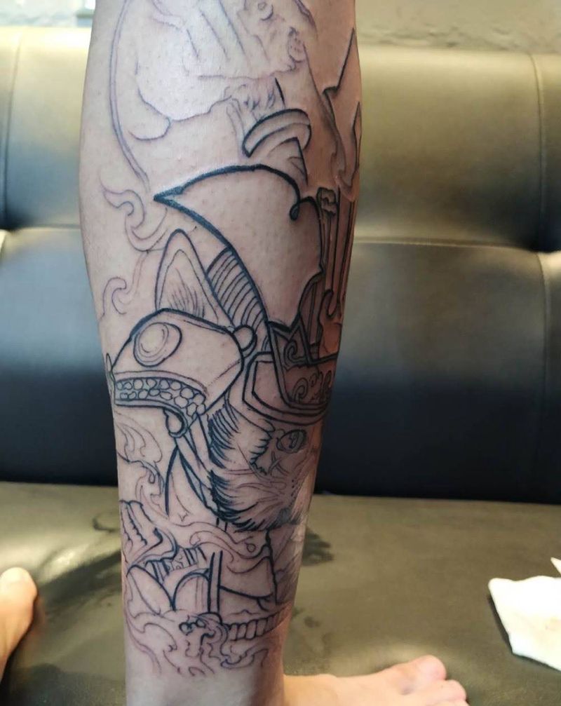 当前位置: 首页 >广东省韶关市纹身店-将也刺青TATTOOSTUDIO纹身图案>小腿割线纹身图片