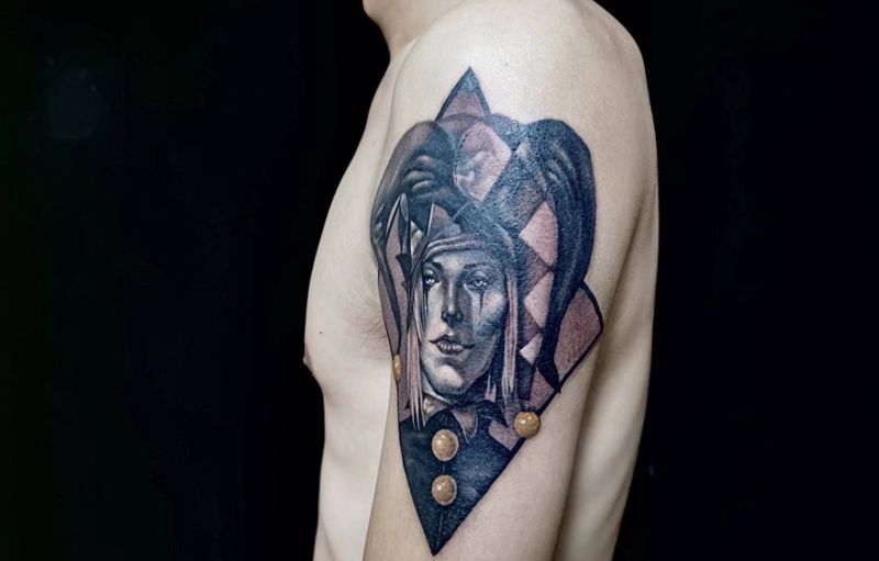 当前位置: 首页 >广东省深圳市纹身店-文人墨刻Tattoo Studio纹身图案>小丑 覆盖纹身图片_手臂欧美写实纹身图案