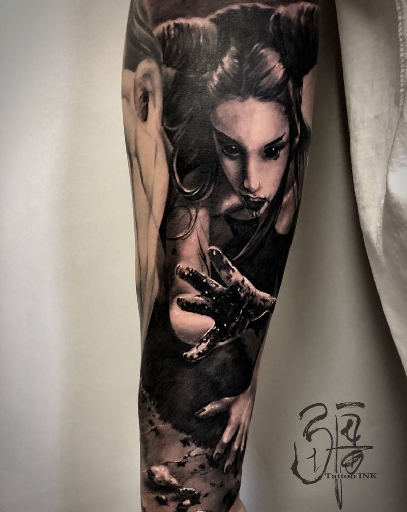 当前位置: 首页 >广东省深圳市纹身店-疆刺纹身工作室纹身图案>black纹身图片_手臂手部欧美写实暗黑纹身图案