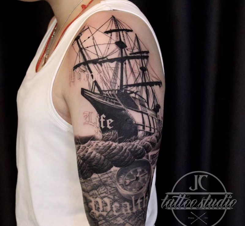 航海 未完成 待續纹身图片_成品手部臀部手臂欧美写实静物原创帆船纹身图案