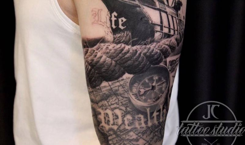 航海 未完成 待續纹身图片_成品手部臀部手臂欧美写实静物原创帆船纹身图案