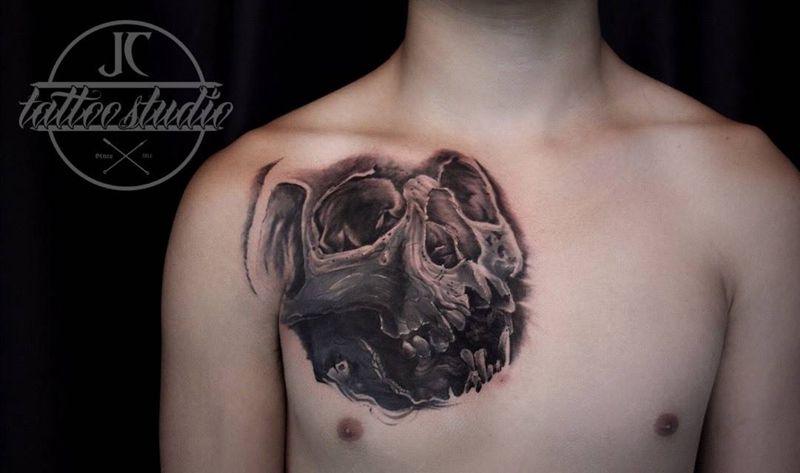 当前位置: 首页 >广东省深圳市纹身店-疆刺纹身工作室纹身图案>骷髅纹身图片_成品胸部欧美写实鬼神原创覆盖纹身图案