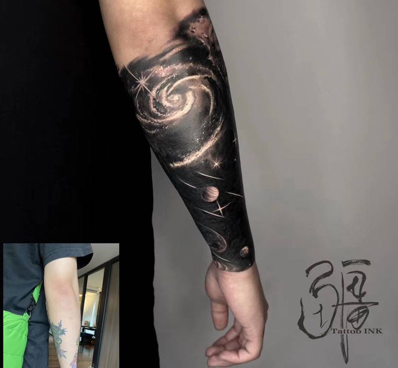 黑出宇宙纹身图片_手臂手部点刺欧美写实遮盖纹身图案