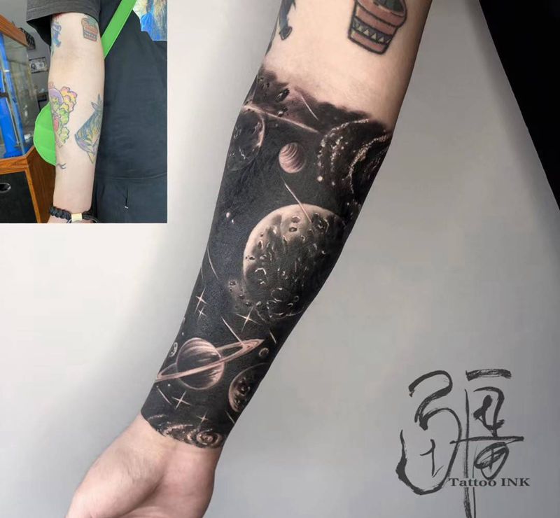 黑出宇宙纹身图片_手臂手部点刺欧美写实遮盖纹身图案
