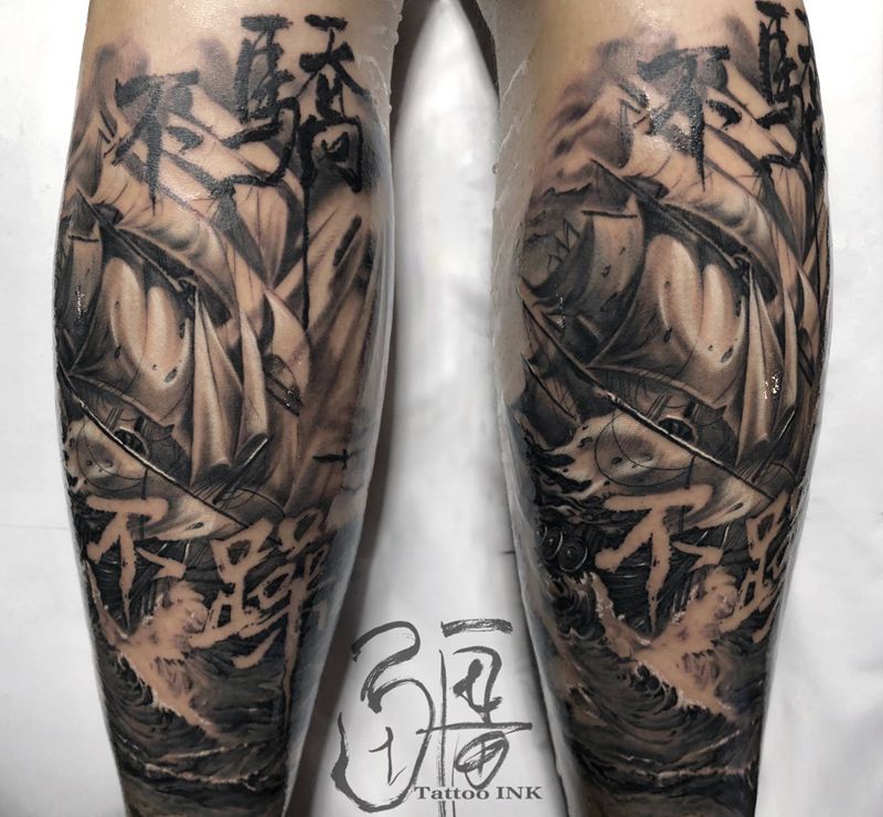 当前位置: 首页 >广东省深圳市纹身店-疆刺纹身工作室纹身图案>不驕不躁!纹身图片_腿部脚部欧美写实水墨帆船纹身图案