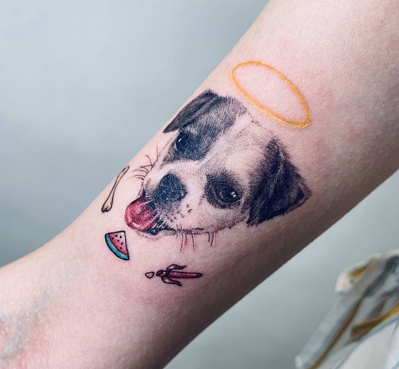 当前位置: 首页 >广东省深圳市纹身店-深圳南無刺青纹身图案>客人家的狗纹身图片_手臂欧美写实纹身图案