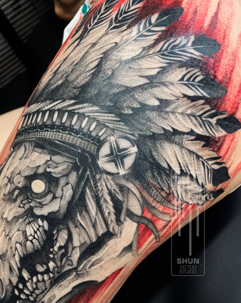 印第安亡灵马儿,完成纹身图片_腿部臀部欧美写实纹身图案
