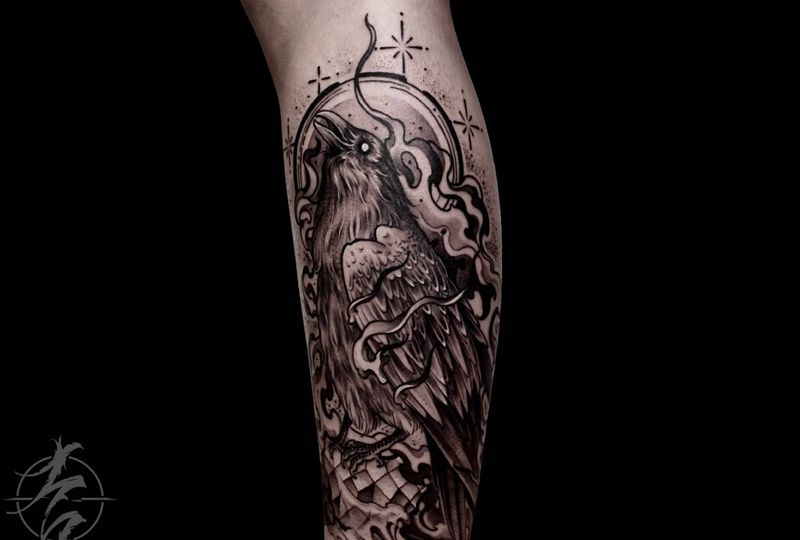 当前位置: 首页 >广东省深圳市纹身店-雨沫刺青纹身图案>暗黑系乌鸦纹身图片_腿部New School纹身图案