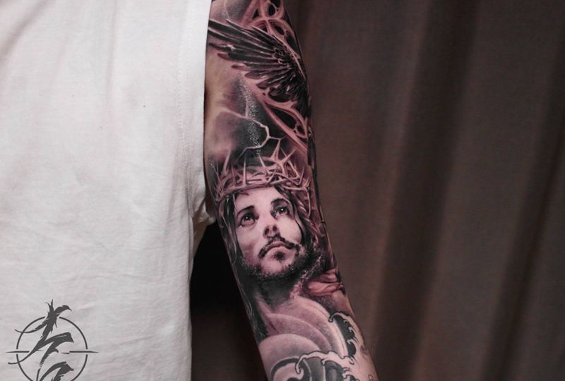 当前位置: 首页 >广东省深圳市纹身店-雨沫刺青纹身图案>耶稣VS天使纹身图片_手臂欧美写实耶稣 天使纹身图案