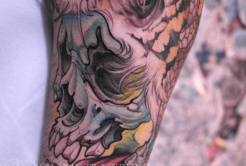 当前位置: 首页 >广东省深圳市纹身店-雨沫刺青纹身图案>老虎➕骷髅纹身图片_肩部手臂新传统New School老虎骷髅纹身图案