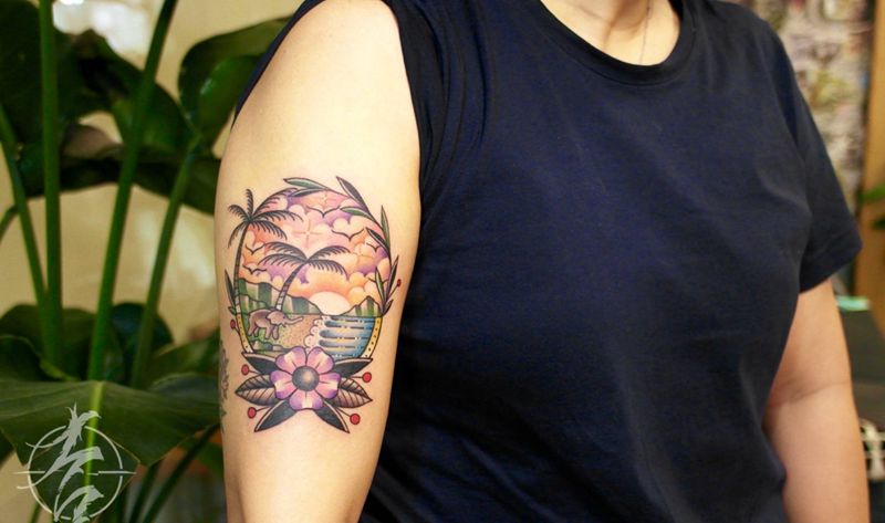 old school纹身图片_臀部手臂Old School大象椰子树海滩纹身图案