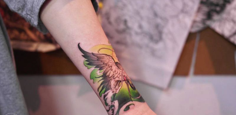 当前位置: 首页 >广东省深圳市纹身店-雨沫刺青纹身图案>鹤纹身图片_手部背部水彩新传统鹤动物纹身图案
