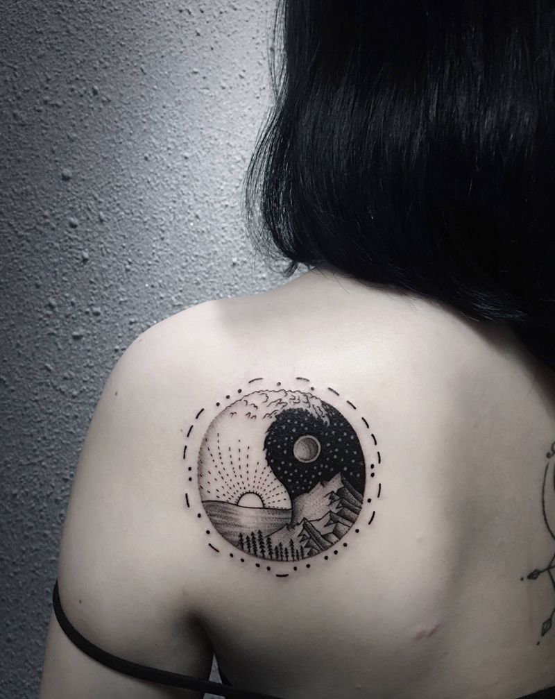 山海纹身图片_背部点刺几何纹身图案