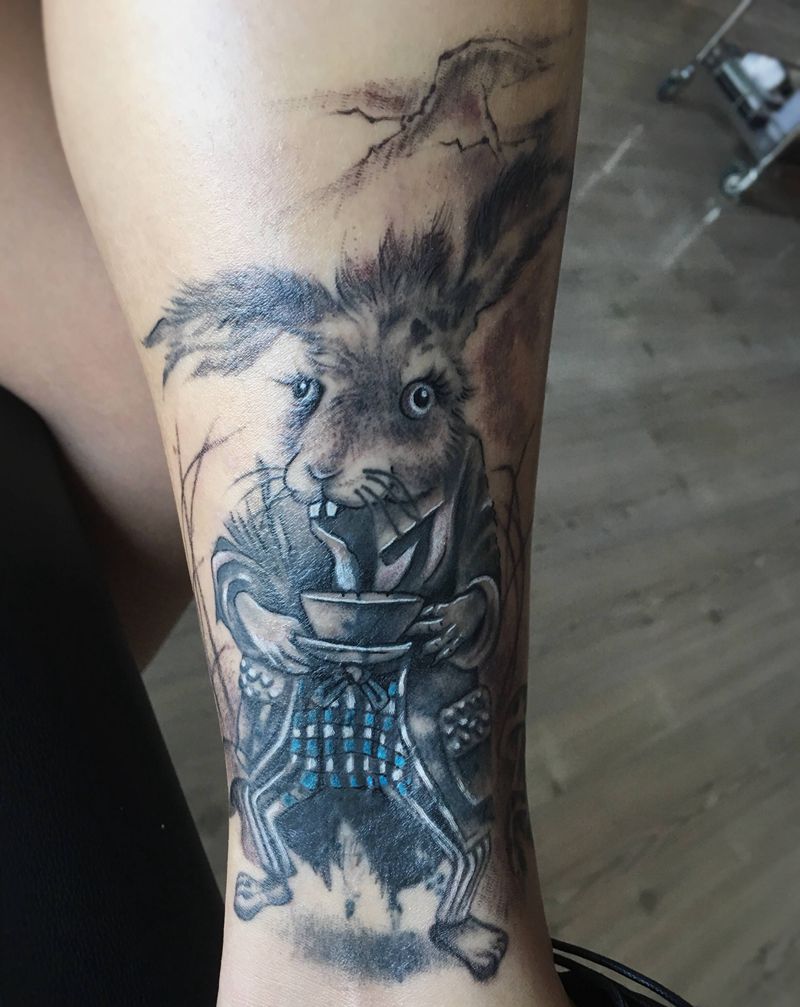 当前位置: 首页 >广东省深圳市纹身店-肆月TATTOO纹身图案>(兔先生)遮盖纹身图片_腿部欧美写实纹身图案