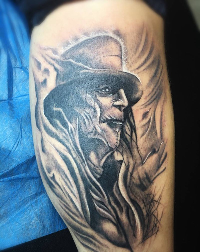 莫里亚蒂纹身图片_成品腿部写实肖像欧美鬼神宗教人物纹身图案
