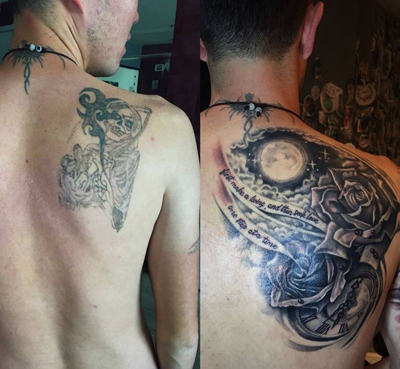 月夜玫瑰(遮盖)纹身图片_成品背部欧美写实植物字符静物纹身图案