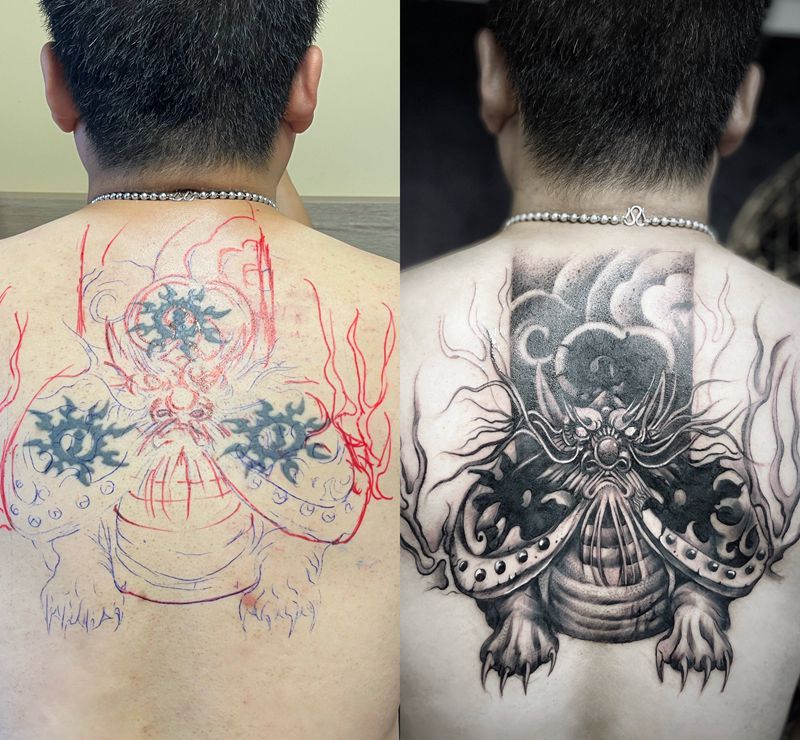 当前位置: 首页 >广东省深圳市纹身店-初见刺青纹身图案>遮盖纹身图片_背部新传统点刺纹身图案