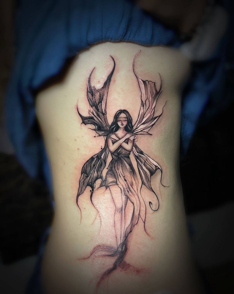 当前位置: 首页 >广东省深圳市纹身店-初见刺青纹身图案>暗黑天使原创纹身图片_腰部水墨欧美写实纹身图案