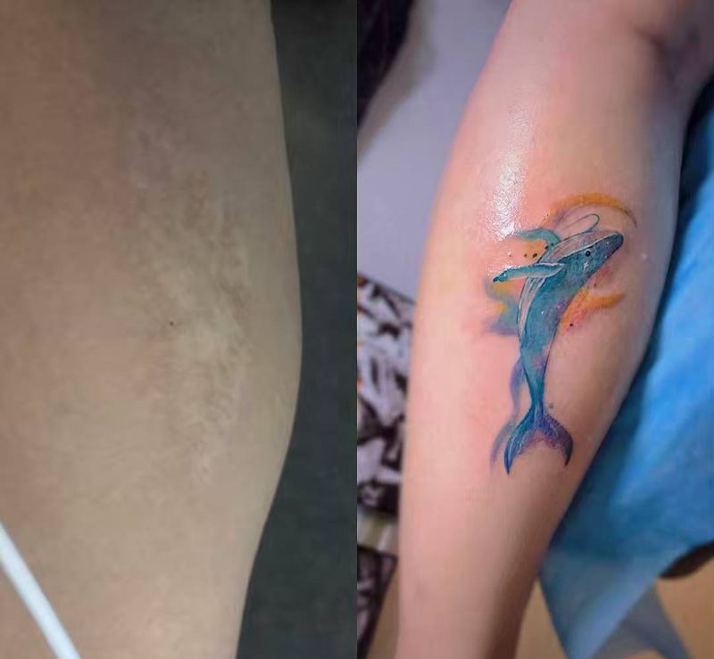 疤痕遮盖水彩纹身图片_腿部水彩纹身图案