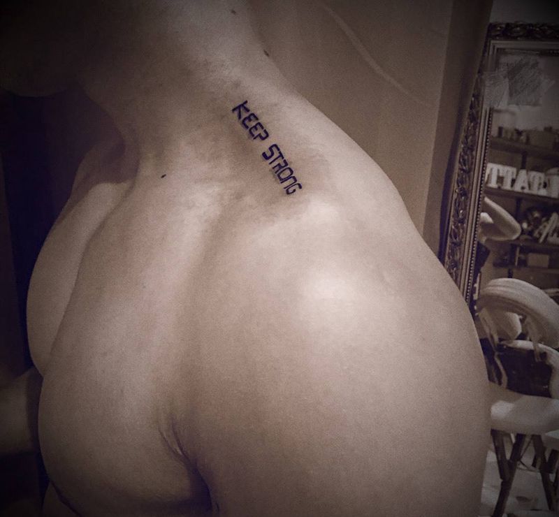 当前位置: 首页 >广东省深圳市纹身店-初见刺青纹身图案>keep strong纹身图片_手臂肩部花体字清新英文字纹身图案