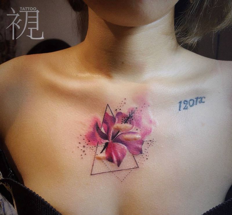 疤痕修饰纹身图片_胸部水彩新传统纹身图案