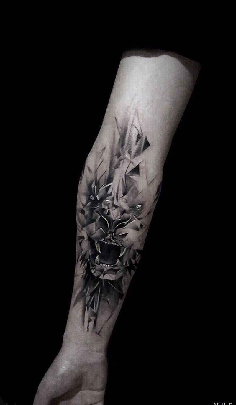 狮子纹身图片_手臂欧美写实几何欧美黑灰纹身图案