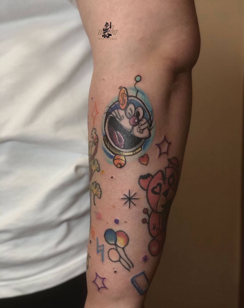世界文化大蓉和纹身图片_手臂New School水彩哆啦A梦兔子达摩蛋纹身图案