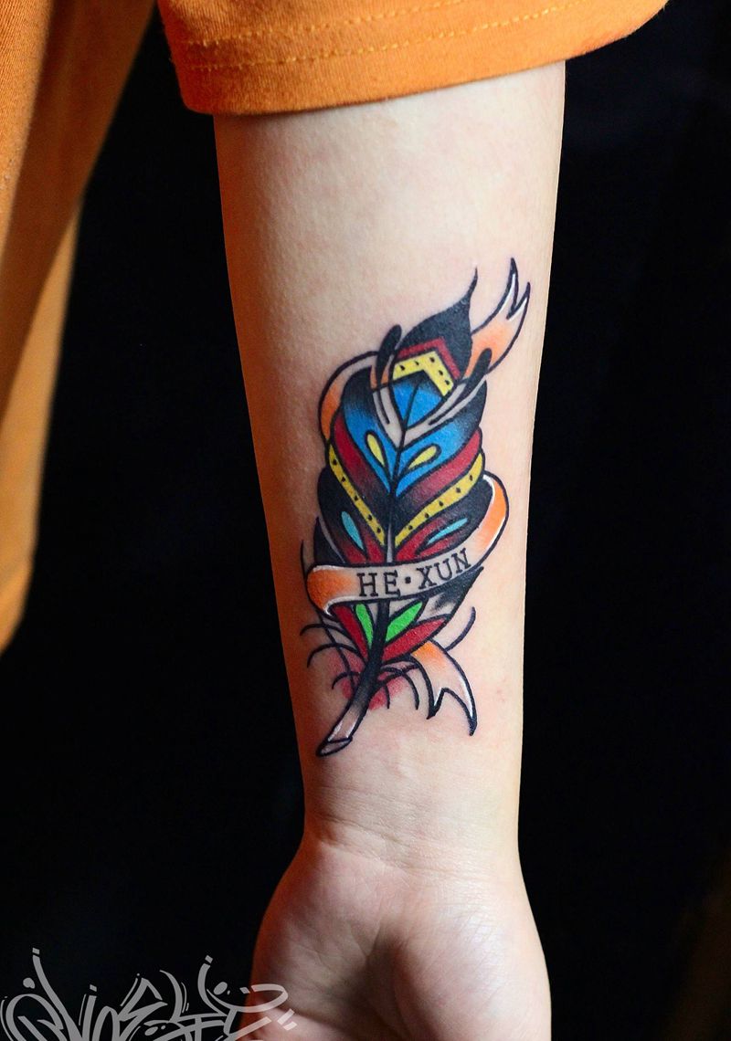 当前位置: 首页 >广东省深圳市纹身店-YIMU纹身图案>Oldschool羽毛纹身图片_手臂Old School纹身图案