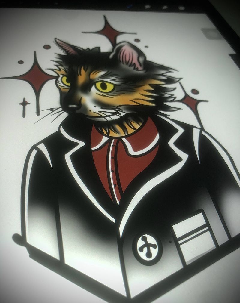 当前位置: 首页 >广东省深圳市纹身店-YIMU纹身图案>猫猫遮盖旧纹身纹身图片_腿部Old School纹身图案