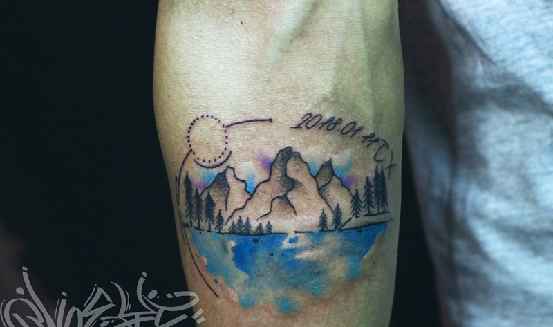 水彩山水纹身图片_手臂点刺水墨水彩山水纹身图案