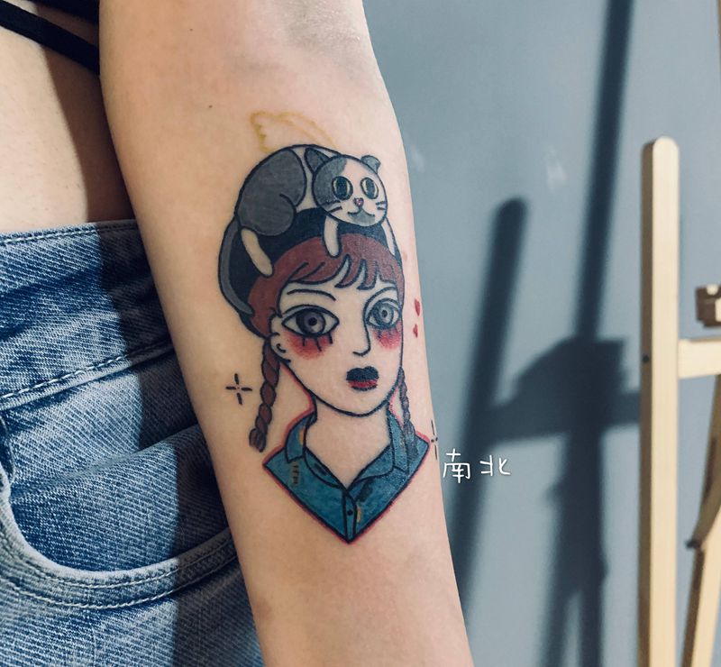 当前位置: 首页 >广东省深圳市纹身店-南北刺青工作室纹身图案>小姐姐和她的猫自身形象纹身图片_手臂纹身图案