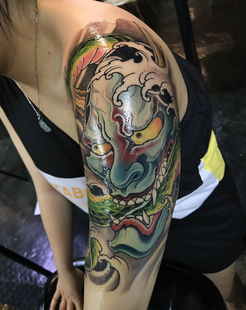 • T网红王老大花腿龙纹身图片_腿部新传统纹身图案