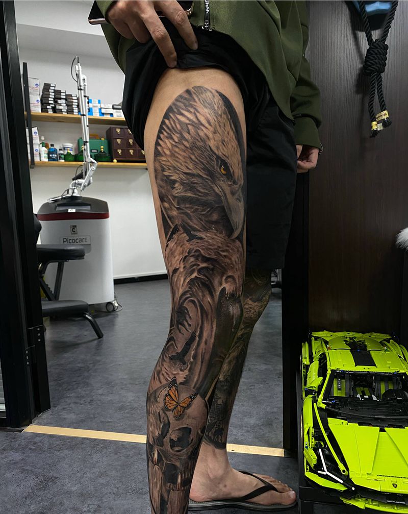 • T网红王老大花腿龙纹身图片_腿部新传统纹身图案
