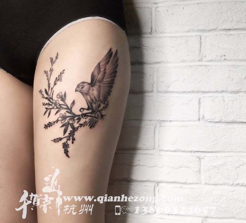 大腿素鸟纹身图片