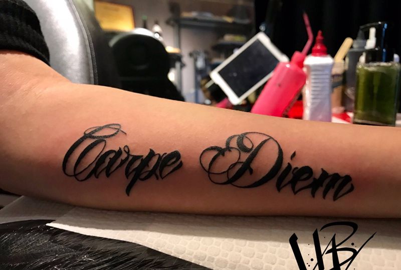 及时行乐纹身图片_手臂花体字纹身图案
