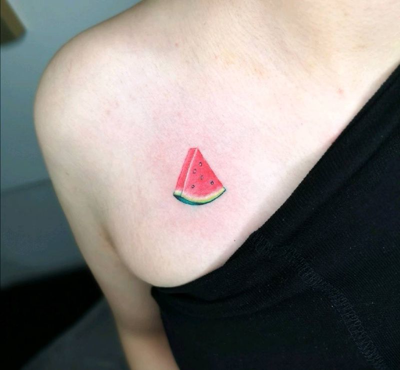 西瓜小清新纹身图片_肩部胸部水彩欧美写实水果西瓜纹身图案