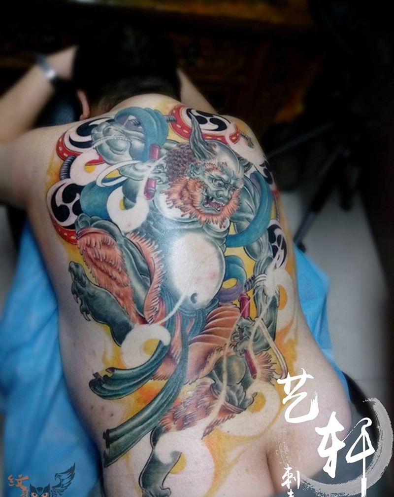 当前位置: 首页 >广东省深圳市纹身店-深圳南山艺轩纹身工作室纹身图案>彩色雷神满背纹身图片_传统背部鬼神纹身图案