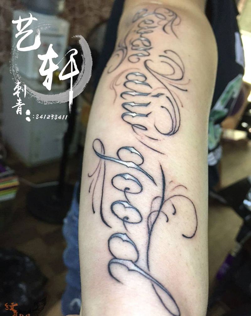 当前位置: 首页 >广东省深圳市纹身店-深圳南山艺轩纹身工作室纹身图案>花体英文作品纹身图片_清新手臂字符纹身图案